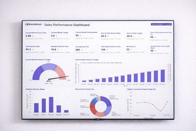 Display live sales performance dashboards on office screens so teams can track targets and results throughout the day. Dashplay integrates with BI platforms to show real-time sales metrics, helping managers and teams stay aligned, motivated and focused on performance.